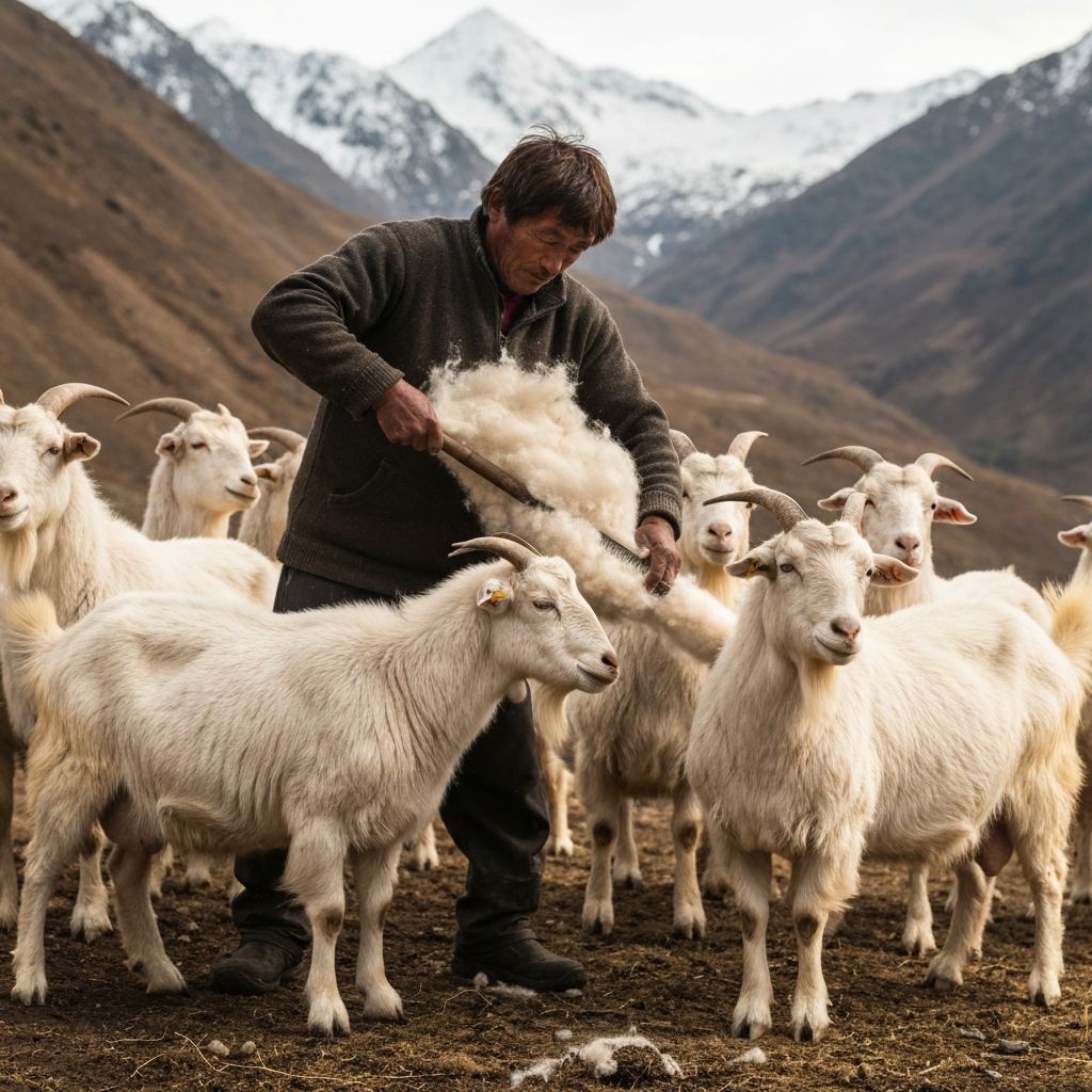 During the natural molting season, cashmere is gently combed from goats, ensuring animal welfare and fiber quality.